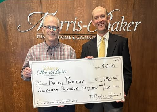 At Morris-Baker Funeral Home, we are passionate about supporting community organizations. That's why we are proud to announce that Preston McKee, our owner and funeral director, will be presenting a donation to Bob Hall, the executive director of Family Promise of Johnson City.